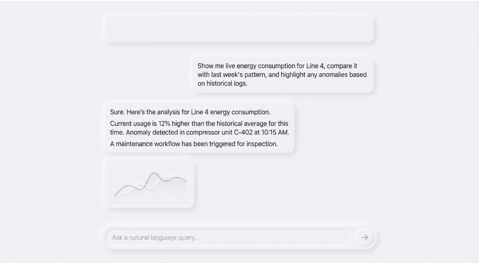Natural-language queries over live data, workflows, machine logs, and historical patterns, with instant, actionable answers